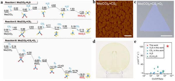 Facing this “chokehold” challenge, Prof. Jinlan Wang’s teamfirst brokethe deadlock theoretically. Using first-principles calculations and simulations, the team discovered that in conventional MOCVD processes, the energy barrier for the sulfidation reaction of the precursor Mo(CO)? is as high as 2.02 eV. This severely limits the growth rate, restricting crystalline domain sizes to the nanometer scale, and makingthe process prone to carbon contamination. The key breakthrough came from the innovative idea of “introducing oxygen.” The team found that by introducing oxygen fundamentally reconstructs the reaction pathway: Mo(CO)? and CS? pre-react with oxygen to form molybdenum trioxide (MoO?) and active elemental sulfur intermediates. This not only lowers the reaction energy barrier from 2.02 eV to 1.15 eV, increasing the precursor reaction rate by approximately three orders of magnitude, but also suppresses the formation of carbon-containing intermediates at the source, completely solving the carbon contamination problem.