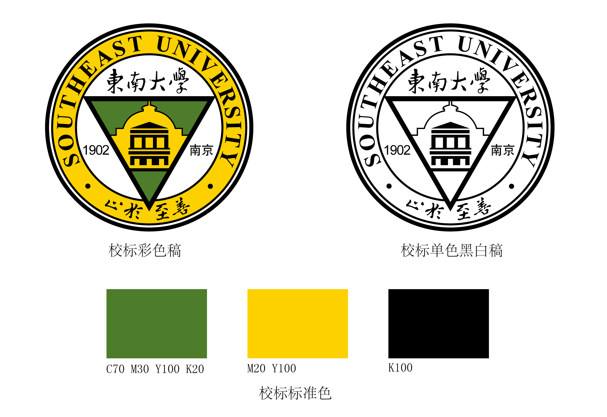 4. Beside the inverted triangle, there are three archy areas inside the inner circle.The Chinese name of the university “Dong Nan Da Xue” is located in the top arch. The year “1902”in the lower-left arch symbolizes that the history of SEU can date back to 1902, on which year Sanjiang Normal College was founded. The Chinese words of “Nanjing” in the lower-right arch represent the location of our university.